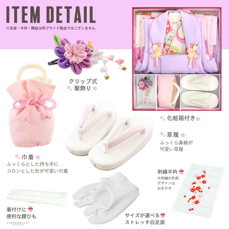 【商品内容】長襦袢・着物・重ね衿(縫い付け済)・被布コート・巾着・草履・髪飾り・刺繍半襟(プレゼント)・足袋(プレゼント)・腰ひも1本(プレゼント)の計10点