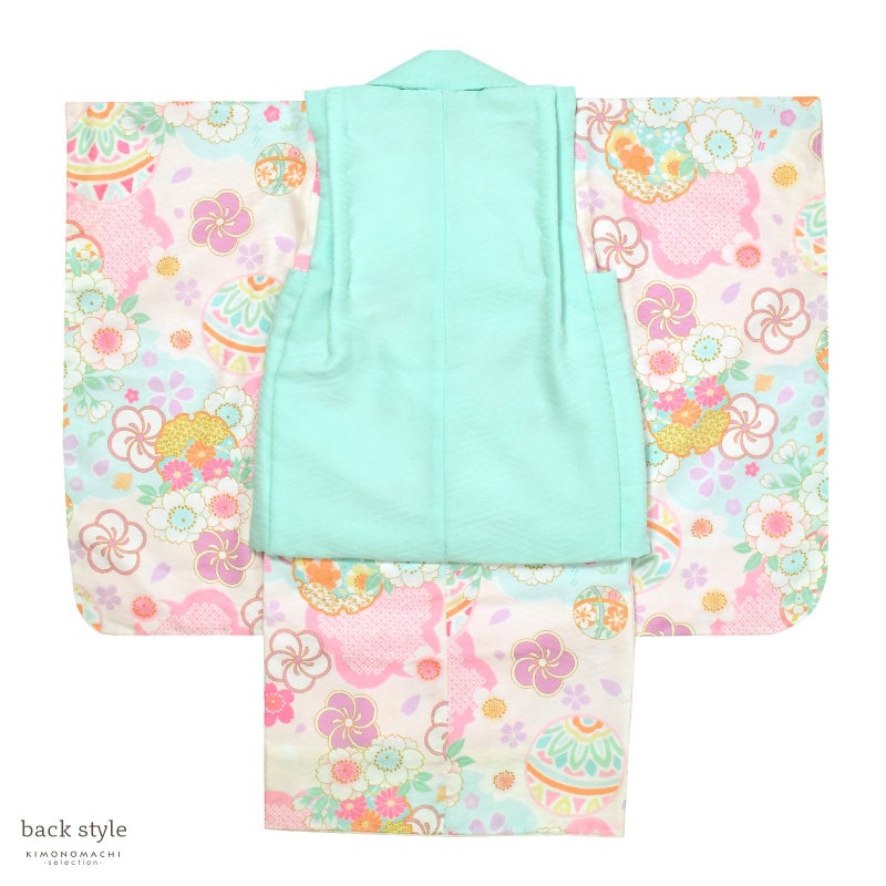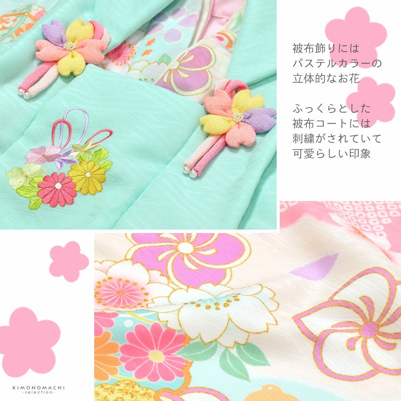【色柄】被布コートは明るいミントブルーの地にピンクや水色、薄黄色の薬玉や花の丸の刺繍。薄ピンクや黄色のつまみの桜の被布飾り。着物は紗綾形の地模様のある淡いアイボリー地に淡い水色の雲取り。ピンクの花形。白やピンク色を基調に水色や淡い黄色、薄緑の桜や手鞠、ねじ花、雪輪、千鳥など。重ね衿はアイボリー。薄ピンクの長襦袢。草履は白の台に薄ピンクと白の片ぼかしの鼻緒。巾着は淡いピンクの袋にアイボリーの見返しと持ち手。紫色やピンク、白のつまみのお花の髪飾り。