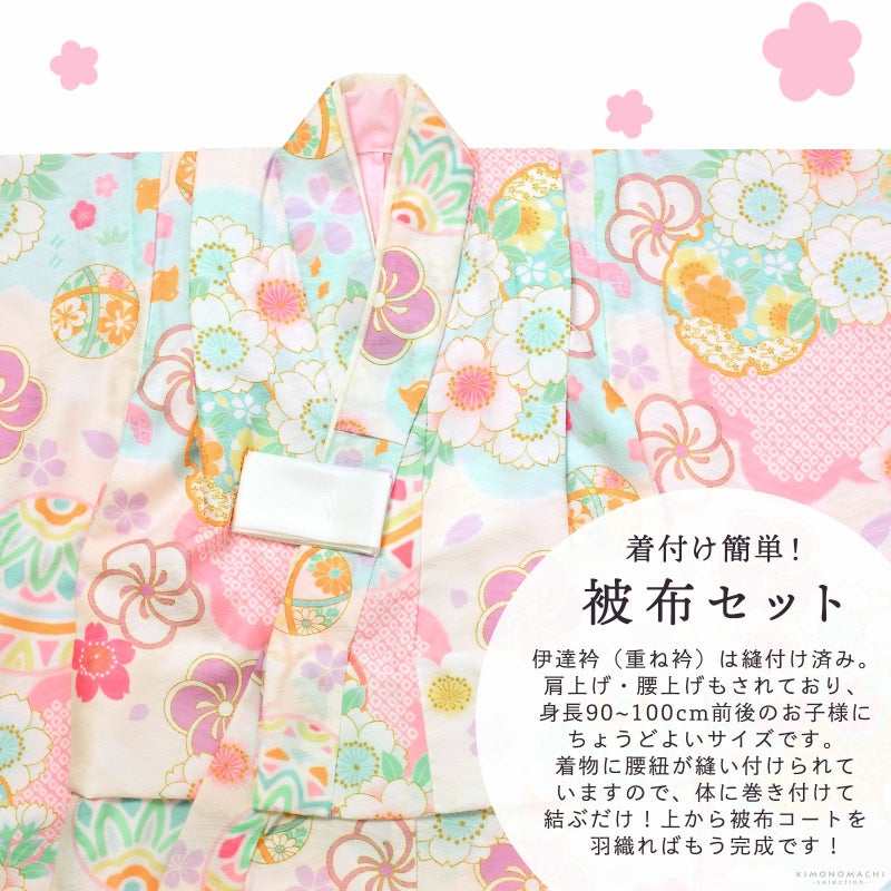 女の子の七五三に!3歳から着られる被布セットです。お着物には重ね衿が縫い付けられています。