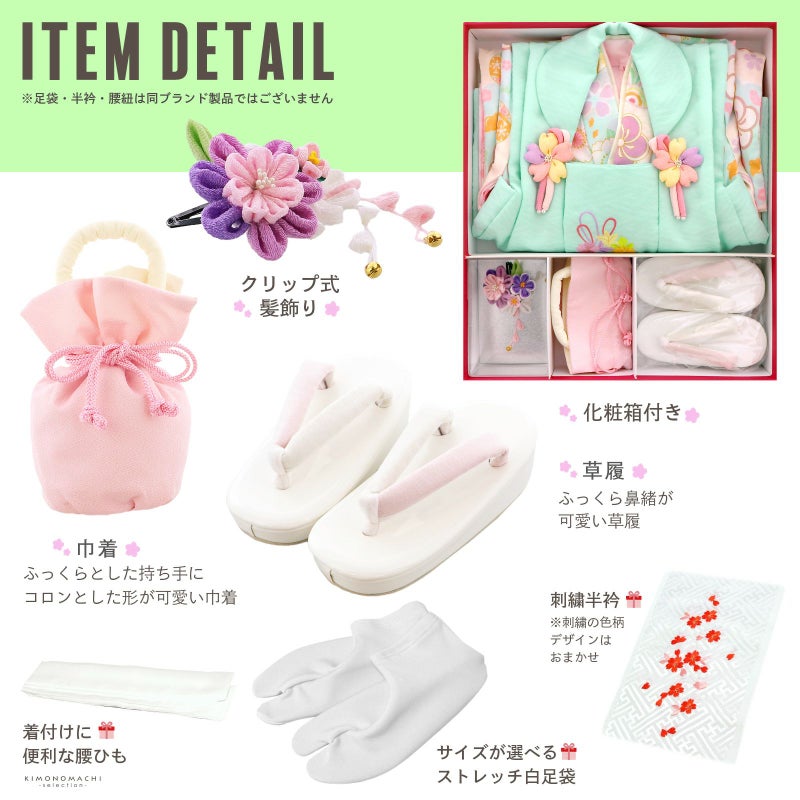 【商品内容】長襦袢・着物・重ね衿(縫い付け済)・被布コート・巾着・草履・髪飾り・刺繍半襟(プレゼント)・足袋(プレゼント)・腰ひも1本(プレゼント)の計10点
