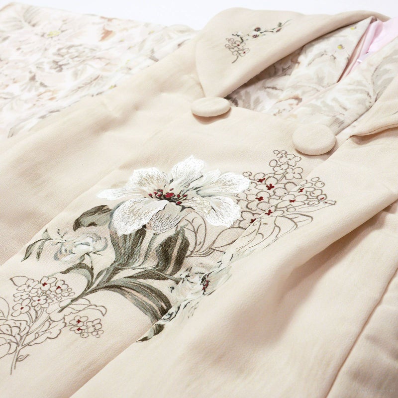 【色柄】被布には、 しとやかに凛と咲く、 白百合をメインモチーフに、着物にはゴブラン風フラワ ーを品よくあしらいました。