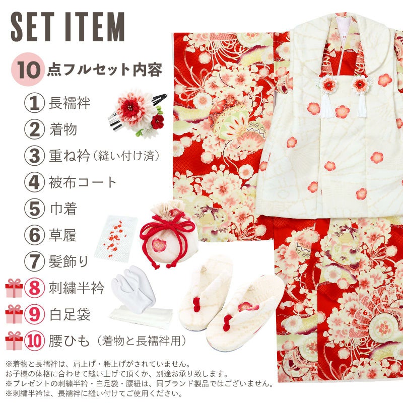 【商品内容】長襦袢・着物・重ね衿(縫い付け済)・被布コート・巾着・草履・髪飾り・刺繍半襟(プレゼント)・足袋(プレゼント)・腰ひも2本(プレゼント)の計10点