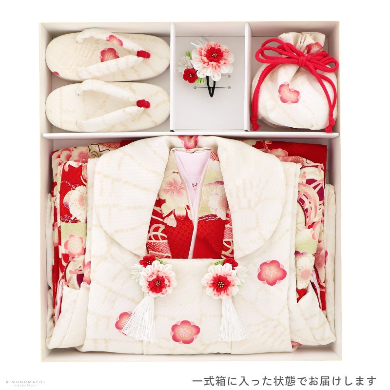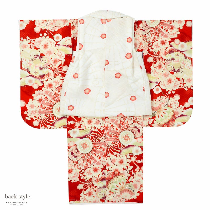 3歳の女の子の七五三に 女児用被布セット お正月やひなまつり(桃の節句)にも 七五三 着物 3歳 女の子 ブランド被布セット 華徒然「オフホワイト×赤 檜扇」三歳女児被布セット 子供着物 フルセット 三才のお祝い着 3才向け【メール便不可】