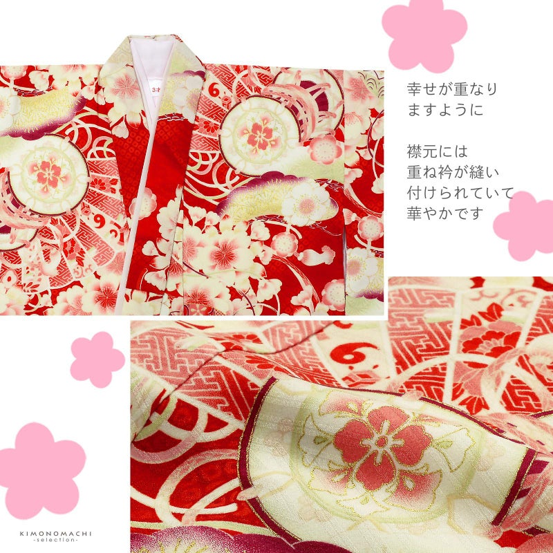 女の子の七五三に!3歳から着られる被布セットです。お着物には重ね衿が縫い付けられています。豪華で女の子らしく華やかなデザイン。七五三だけでなく、お正月やひな祭りの節句にも。