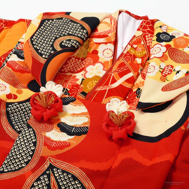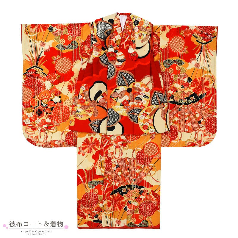 被布コートは濃い赤地に黒、生成り色、橙色、赤を基調とした大きな橘。紅白のつまみのお花の被布飾り。着物は紗綾形の地模様に生成り色、赤、薄橙、山吹色の雲取り。生成り色、橙色、赤を基調とした檜扇や花紋。その上に金彩の縦縞。重ね衿は赤茶色。薄ピンクの長襦袢。草履は黒地にゴールド、赤、白の花入り亀甲文様の台に赤の鼻緒。巾着は被布と共生地。赤、金のリボンに着物と同系色のつまみのお花をあしらった髪飾り。