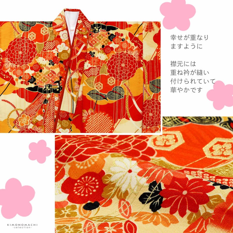 女の子の七五三に!3歳から着られる被布セットです。お着物には重ね衿が縫い付けられています。豪華で女の子らしく華やかなデザイン。七五三だけでなく、お正月やひな祭りの節句にも。