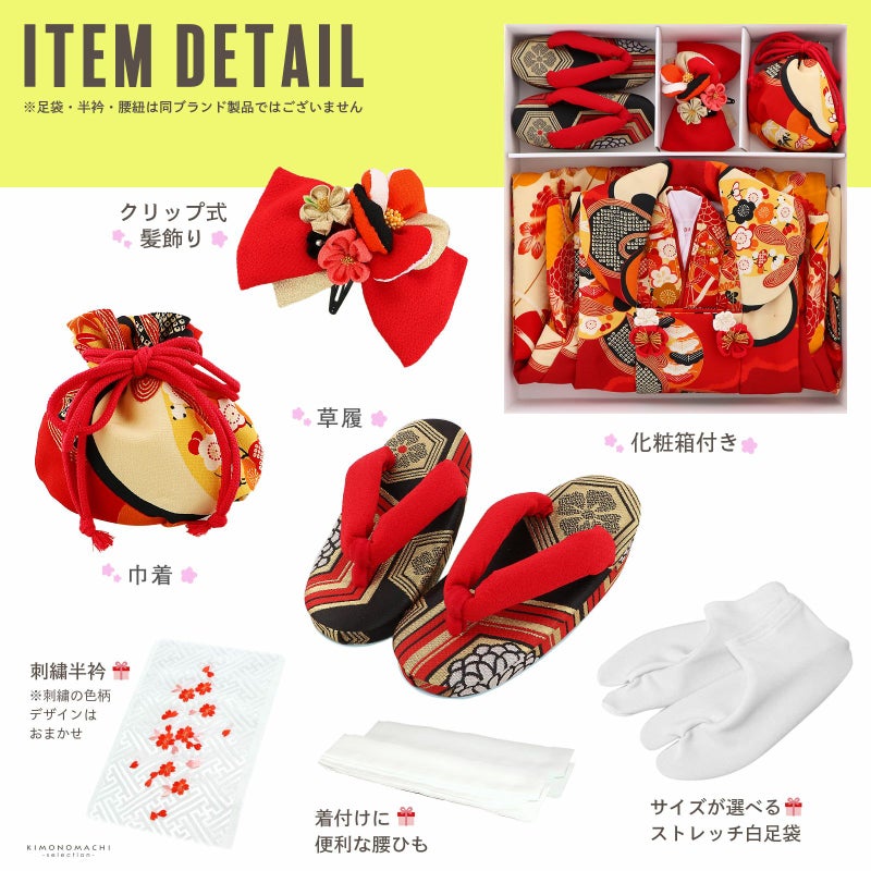 【商品内容】長襦袢・着物・重ね衿(縫い付け済)・被布コート・巾着・草履・髪飾り・刺繍半襟(プレゼント)・足袋(プレゼント)・腰ひも2本(プレゼント)の計10点