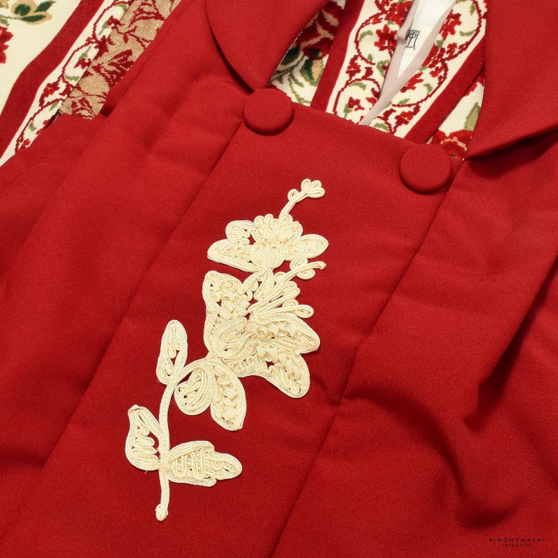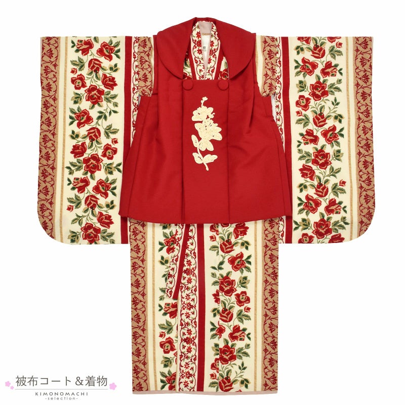 被布コートは深い赤の地に生成り色のコード刺繍で表現されたお花。くるみボタンの被布飾り。着物は唐草の地模様のあるアイボリーの地に薄茶、深い赤の縦縞。縞の中に深い赤、薄茶、深緑色の花唐草や蔓バラ。クロスステッチ調の抽象的な表現が個性的です。重ね衿は薄茶色。薄ピンクの長襦袢。草履は生成り色の台に深い赤の鼻緒。巾着は深い赤。深い赤の台にフリル、くすんだ濃いピンクのリボンのついた髪飾り。