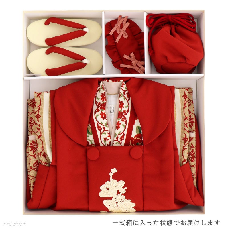 【商品内容】長襦袢・着物・重ね衿(縫い付け済)・被布コート・巾着・草履・髪飾り・刺繍半襟(プレゼント)・足袋(プレゼント)・腰ひも2本(プレゼント)の計10点