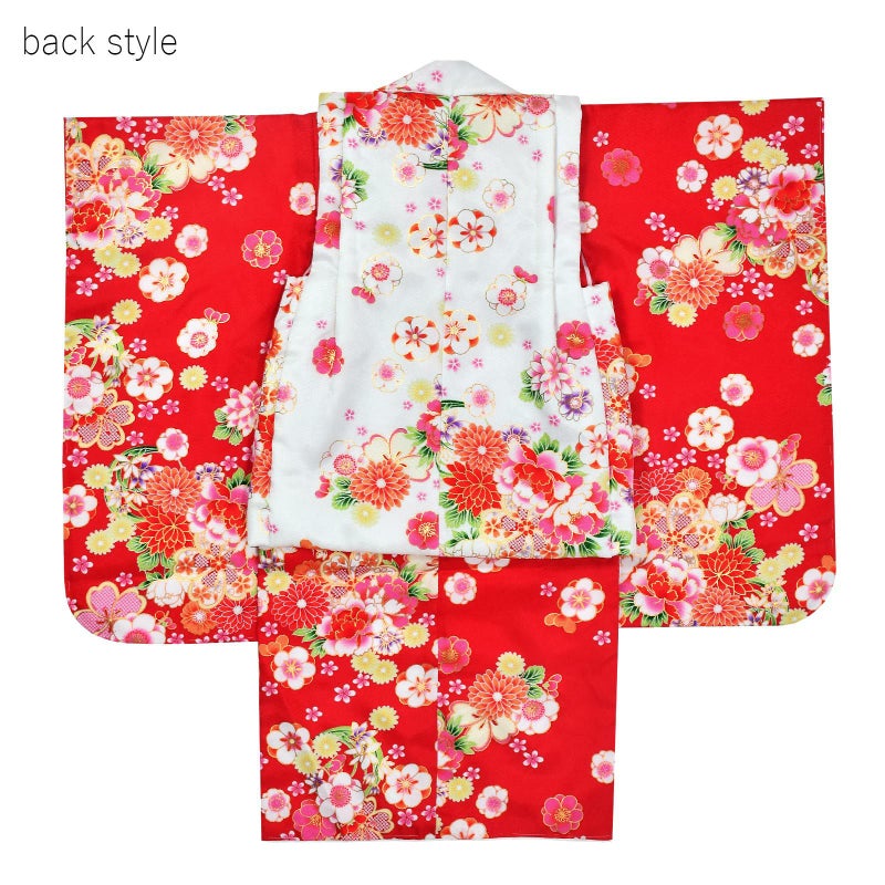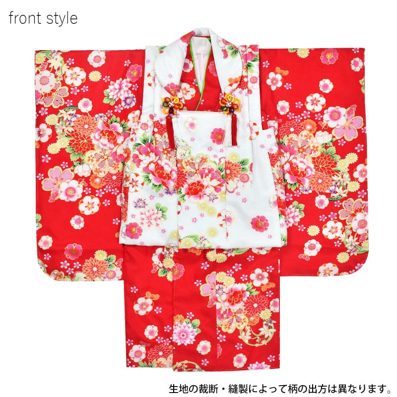 【色柄】被布コートは紗綾形の地模様のある白地に赤やピンクを基調とした牡丹、花紋や花の丸。黄色や赤、緑の花結びに紅白の房の被布飾りがついています。着物は明るい赤地、白にピンクぼかしやオレンジ色の桜模様。赤や濃いピンク、淡い黄色、緑の花紋や花の丸が全体に散らされています。ポイントに金彩。明るい緑の重ね衿。薄ピンクの長襦袢。赤いリボンに薄ピンクのつまみのお花の髪飾り。着物と共生地の草履と巾着。