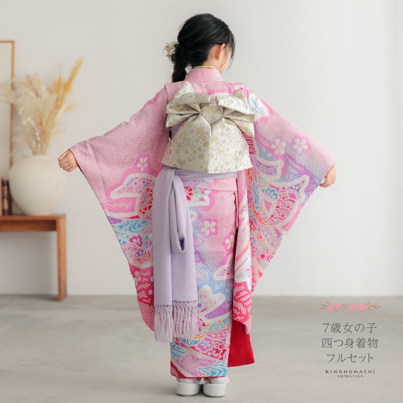 七歳の七五三(四つ身着物)の着付けに必要なものが揃ったフルセットです。お洒落で女の子らしい雰囲気。