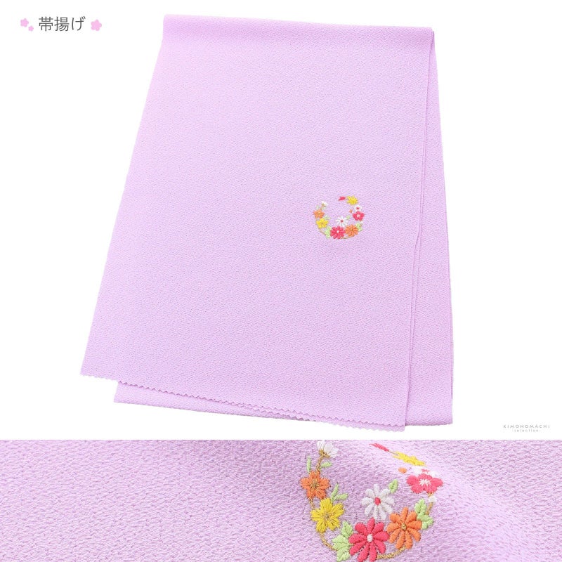 しごきと帯揚げは淡い藤色。ポイントに花の丸の刺繍。