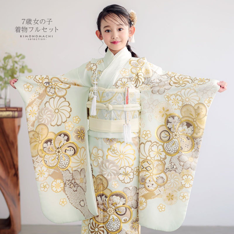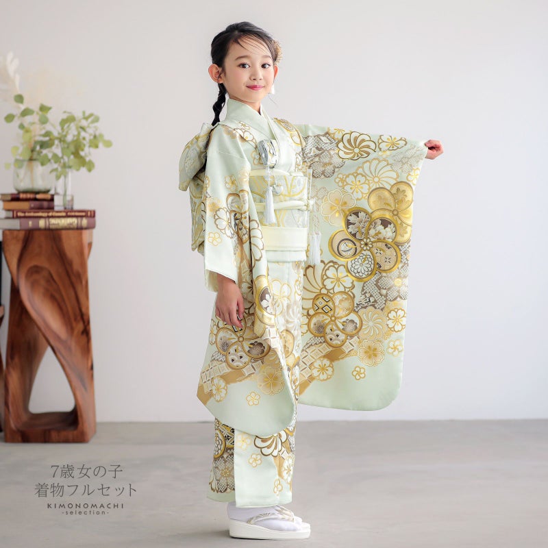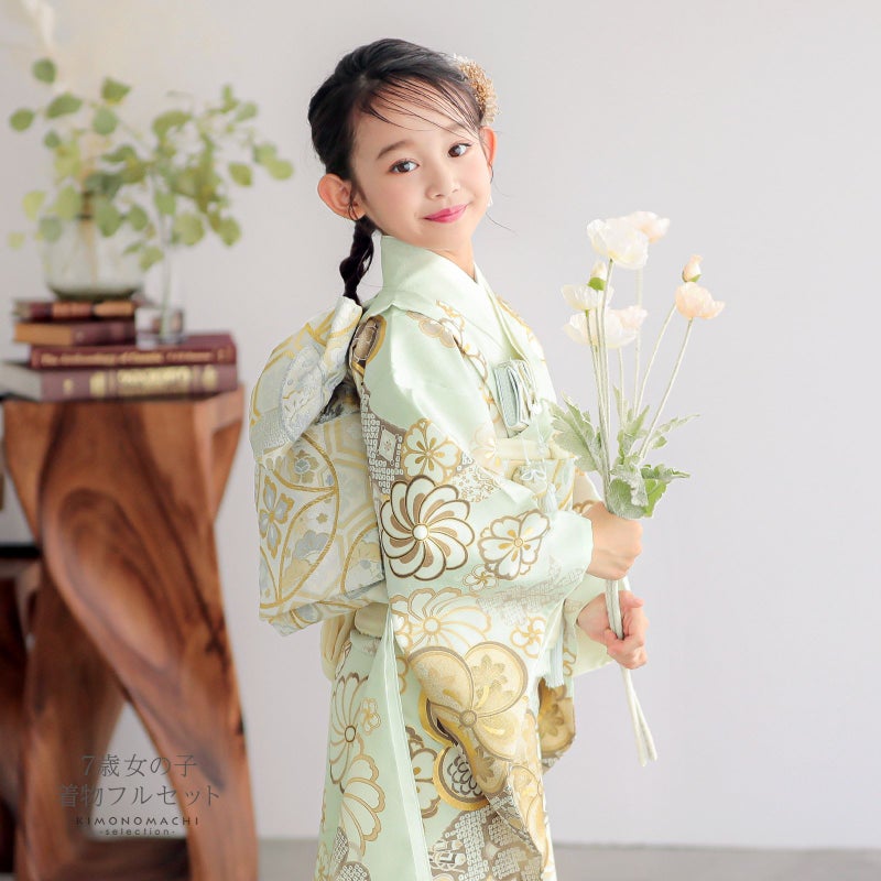 七歳の七五三(四つ身着物)の着付けに必要なものが揃ったフルセットです。お洒落で女の子らしい雰囲気。