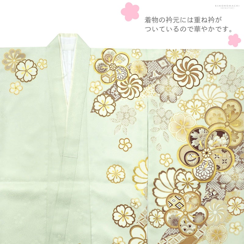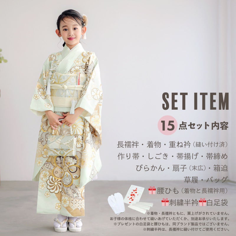 【商品内容】長襦袢・着物・重ね衿(縫い付け済)・作り帯・しごき・帯揚げ・帯締め・びらかん・扇子(末広)・箱迫・草履・バッグ・足袋(プレゼント)・腰ひも3本(プレゼント)・刺繍半衿(プレゼント)の計15点