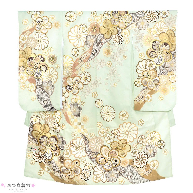 着物:紗綾形に花の地模様、ごく淡い灰緑色の地。白、白茶に白橡色、グレージュ、ベージュ系の配色で吉祥紋を詰めた道長取り。その上に大小の捩じ花や桜、梅、菊の花紋。ポイントに金彩。アイボリーの重ね衿。白の長襦袢。
