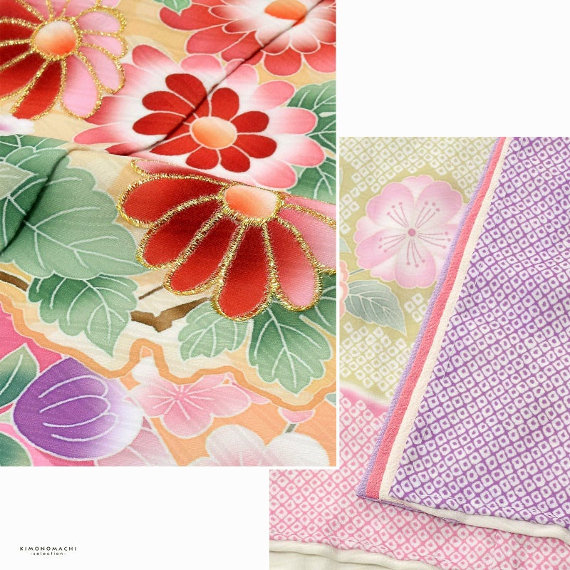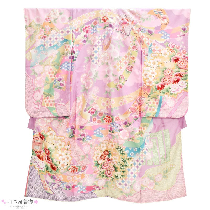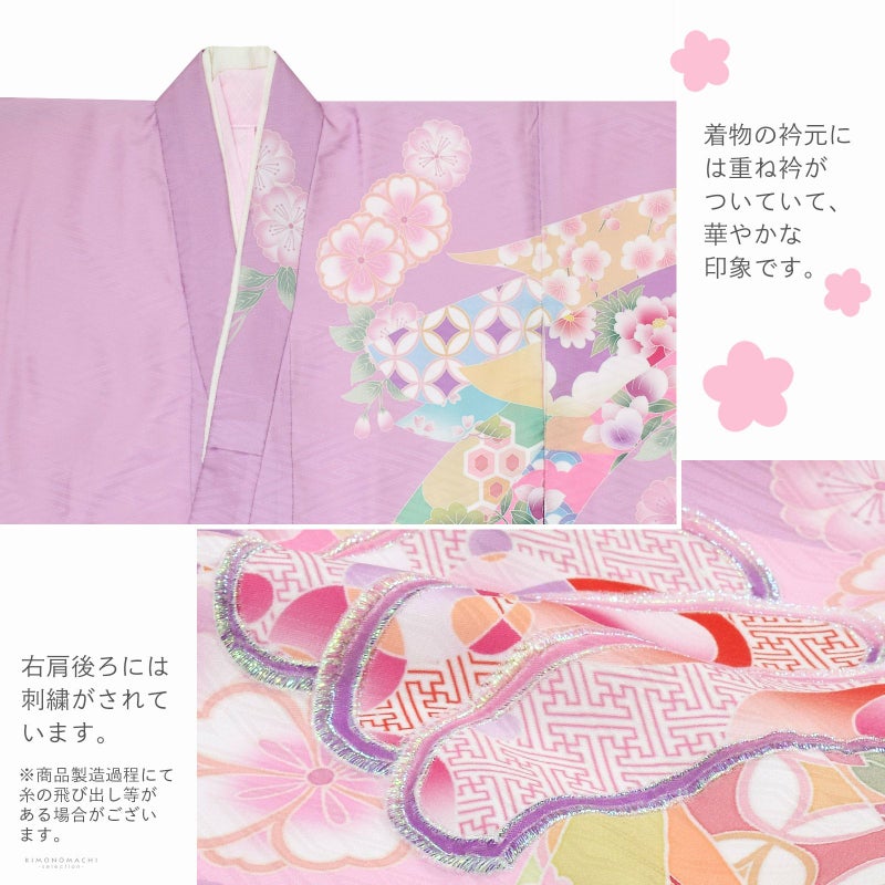 着物はややグレイッシュな淡いピンクパープルの地に紗綾形の地模様。淡い桃色や藤色、抹茶色の鹿の子の雲取りや源氏香。背には淡いベージュやピンク、黄緑に吉祥文様を詰めた束ね熨斗。やわらかいピンク、緑、橙、朱色など桜や菊、梅などの四季の花。ポイントに金糸やラメ糸の刺繍。褄下に藤色、桃色、オフホワイトの比翼風の飾り布。重ね衿はオフホワイト。