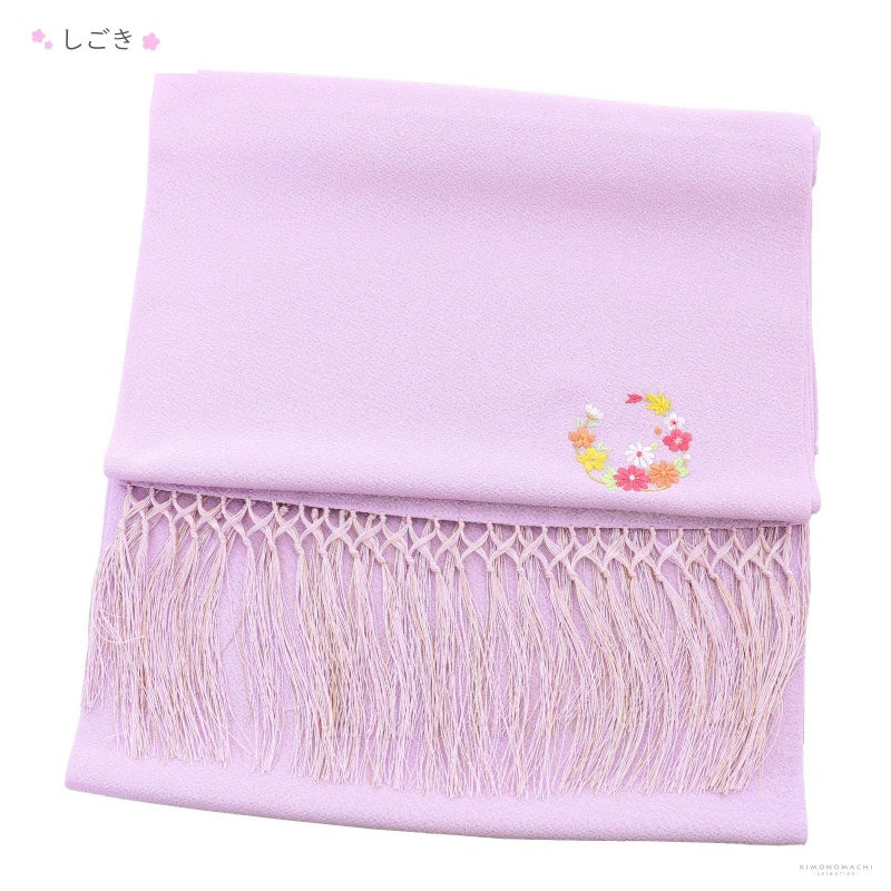 しごきと帯揚げは淡い藤色。ポイントに花の丸の刺繍。