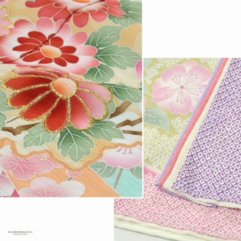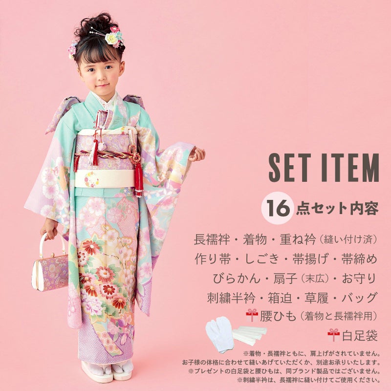 【商品内容】長襦袢・着物・重ね衿(縫い付け済)・結び帯(作り帯)・しごき・帯揚げ・帯締め・お守り・箱迫・びらかん・扇子(末広)・刺繍半衿・草履・バッグ・足袋(プレゼント)・腰ひも3本(プレゼント)の計16点