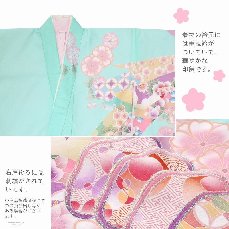 着物はややグレイッシュな淡いミントブルーの地に紗綾形の地模様。淡い桃色や藤色、抹茶色の鹿の子の雲取りや源氏香。背には淡いベージュやピンク、黄緑に吉祥文様を詰めた束ね熨斗。やわらかいピンク、緑、橙、朱色など桜や菊、梅などの四季の花。ポイントに金糸やラメ糸の刺繍。褄下に藤色、桃色、オフホワイトの比翼風の飾り布。重ね衿はオフホワイト。