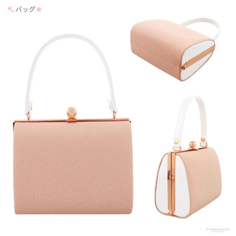 筥迫セット・草履・バッグ:筥迫はベージュピンクの縮緬地。銀のビラカン。ベージュピンクの丸ぐけ帯締め。赤のお守り袋。紅白の房飾り付きの末広。バッグはベージュピンクの縮緬地の本体に、白の持ち手。ピンクゴールドの口金。草履の鼻緒はバッグと共生地、台は白。
