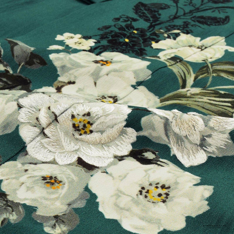 【色柄】着物は木香薔薇と白百合に、 アラベスク風のボタニカル紋様を 添えた印象的なデザイン。 線描きの紫陽花を繊細に織り上げた 帯や小物と相まって、 荘厳さと華やかさで溢れています。