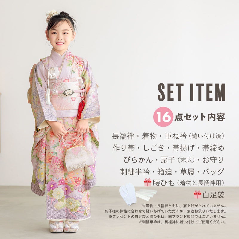 七歳の七五三(四つ身着物)の着付けに必要なものが揃ったフルセットです。お洒落で女の子らしい雰囲気。衿元も重ね衿がついているので華やかです。