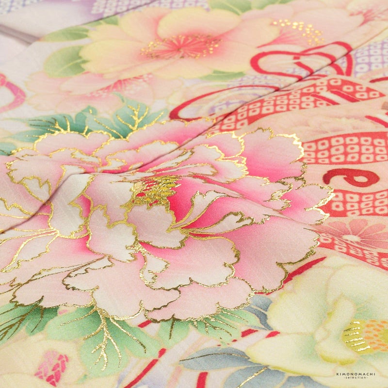 着物:紗綾形の地模様、ややグレイッシュなごく淡い藤色の地。薄紫や青紫色の道長取りに疋田文様。アイボリーに淡いピンクや抹茶色、薄紫を基調とした檜扇に貝桶、御所車、鼓や源氏車などの王朝風の文様。さらに牡丹に八重桜、松、椿、梅、菊などの四季の花が柔らかい色彩で表現されています。ポイントに金彩。重ね衿は淡いアイボリー。長襦袢はごく淡いピンク。