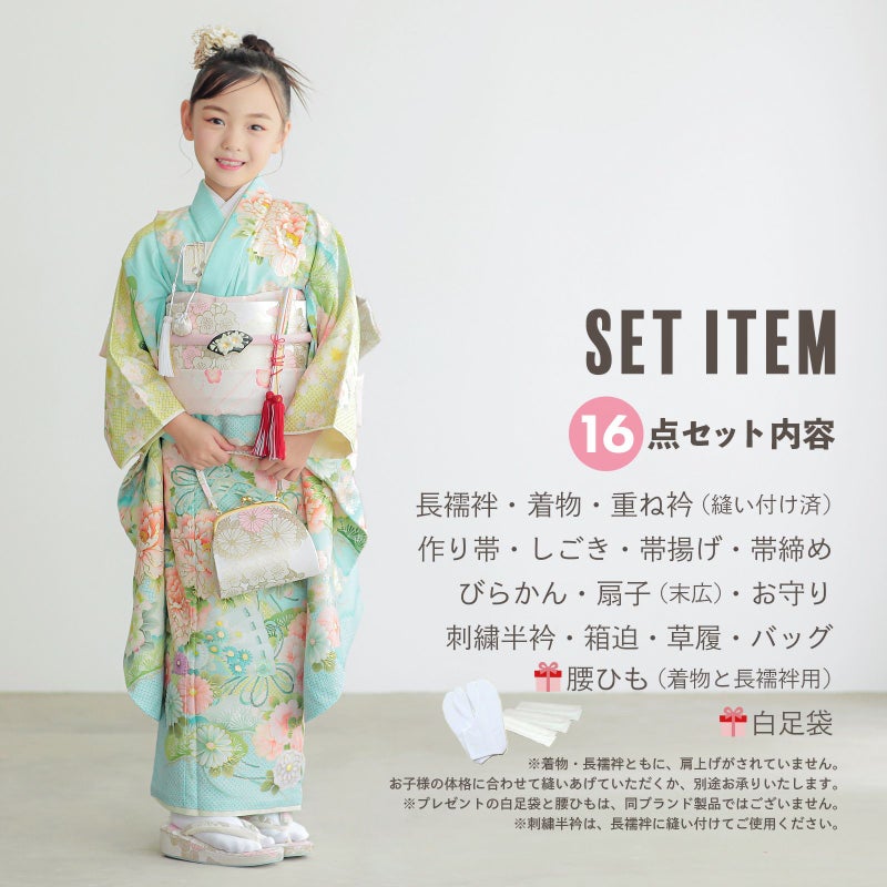 【商品内容】長襦袢・着物・重ね衿(縫い付け済)・結び帯・しごき・帯揚げ・帯締め・帯留・箱迫・びらかん・扇子(末広)・半衿・草履・バッグ・白足袋(プレゼント)・腰ひも3本(プレゼント)の計16点