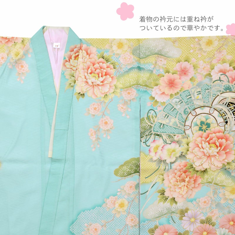 七歳の七五三(四つ身着物)の着付けに必要なものが揃ったフルセットです。お洒落で女の子らしい雰囲気。衿元も重ね衿がついているので華やかです。