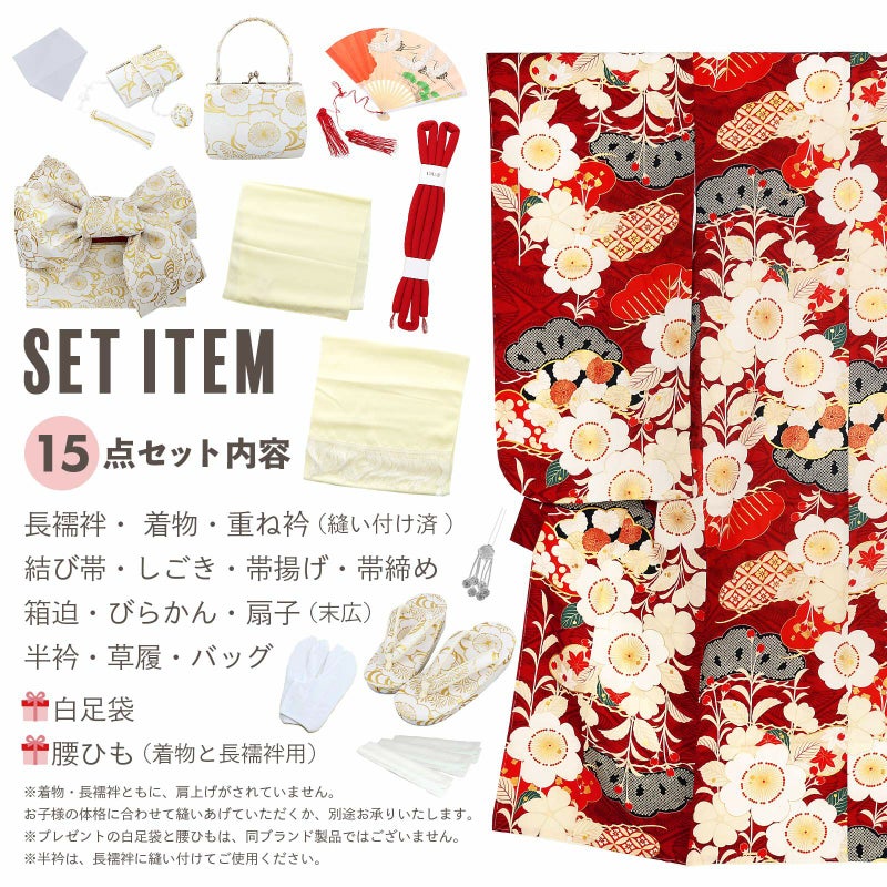 【商品内容】長襦袢・着物・重ね衿(縫い付け済)・結び帯・しごき・帯揚げ・帯締め・箱迫・びらかん・扇子(末広)・半衿・草履・バッグ・白足袋(プレゼント)・腰ひも3本(プレゼント)の計15点
