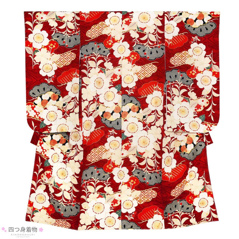 着物:紗綾形に花の地模様のある生地。深い赤色の地に、赤銅色で菱に向かい鶴文様が全体に表現されています。朱赤や黒色、アイボリーの松紋の中に鹿の子や七宝、青海波、花紋などの文様。オフホワイトの枝垂れの裏桜の上に、金と朱赤の蕊のある白い細川桜紋が散らされ、深緑の葉がアクセントを添えています。ポイントに金彩。重ね衿はアイボリー。長襦袢はごく淡いピンク。
