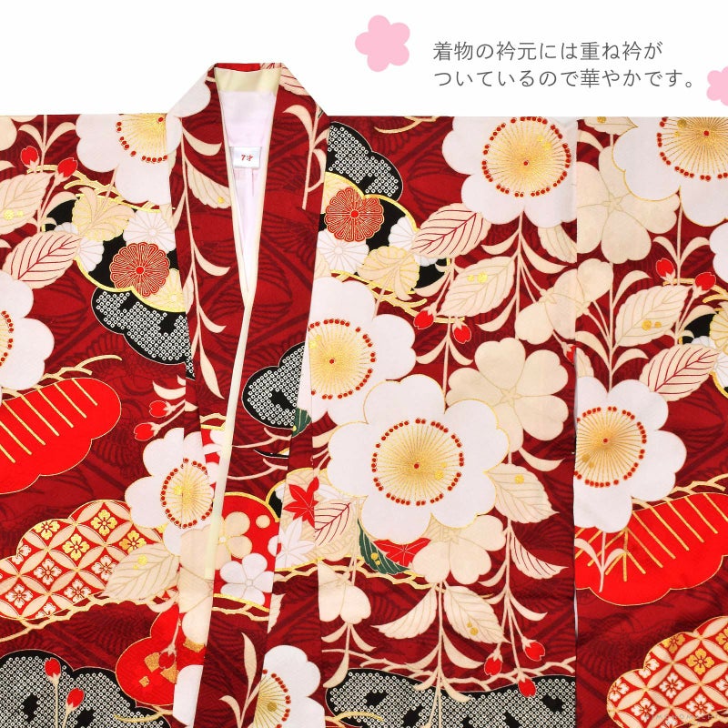 七歳の七五三(四つ身着物)の着付けに必要なものが揃ったフルセットです。お洒落で女の子らしい雰囲気。衿元も重ね衿がついているので華やかです。