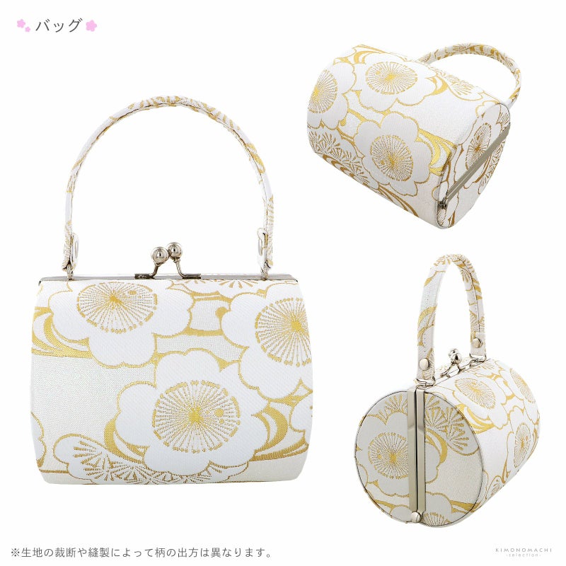 草履・バッグ:バッグは白にラメ通しの地。ゴールドに白を基調とした観世水に松、細川桜紋。メタリックシルバーの口金。草履の台と鼻緒はバッグと共生地。