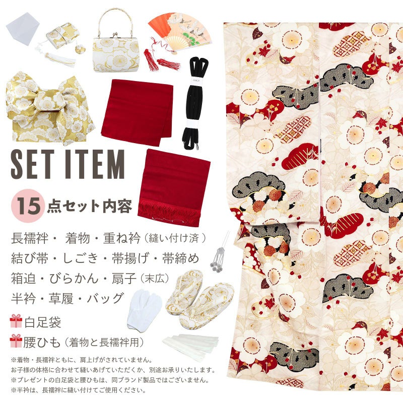 【商品内容】長襦袢・着物・重ね衿(縫い付け済)・結び帯・しごき・帯揚げ・帯締め・箱迫・びらかん・扇子(末広)・半衿・草履・バッグ・白足袋(プレゼント)・腰ひも3本(プレゼント)の計15点