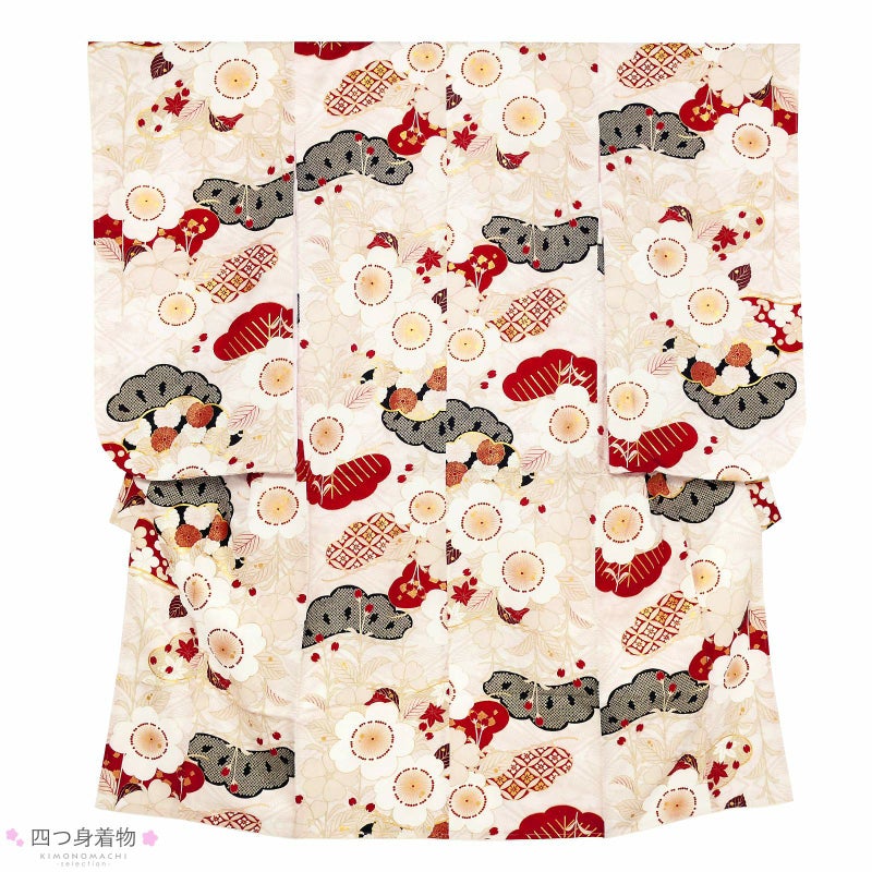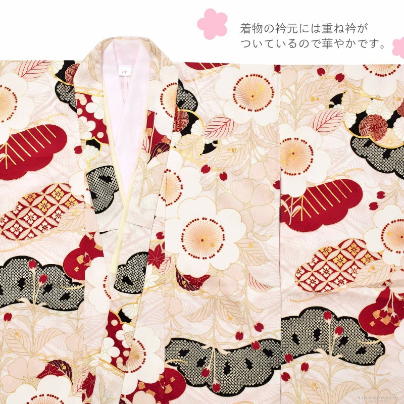 七歳の七五三(四つ身着物)の着付けに必要なものが揃ったフルセットです。お洒落で女の子らしい雰囲気。衿元も重ね衿がついているので華やかです。