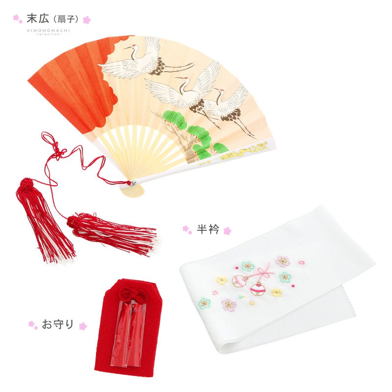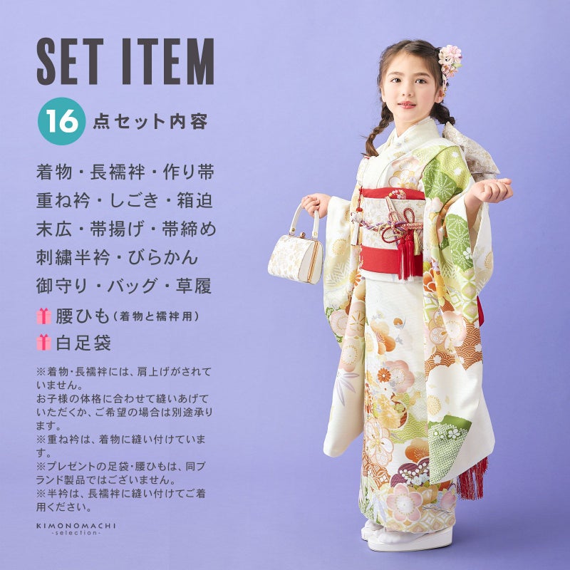 【商品内容】着物・長襦袢・作り帯・重ね衿(縫い付け済)・しごき・箱迫・扇子(末広)・帯揚げ・帯締め・刺繍半衿・びらかん・お守り・バッグ・草履・足袋(プレゼント)・腰ひも3本(プレゼント)の計16点