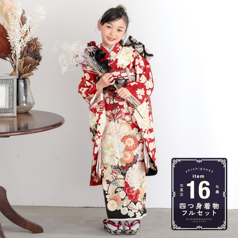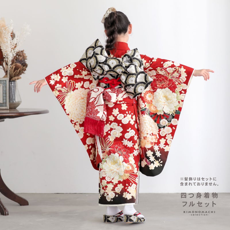 七歳の七五三(四つ身着物)の着付けに必要なものが揃ったフルセットです。お洒落で女の子らしい雰囲気。衿元も重ね衿がついているので華やかです。
