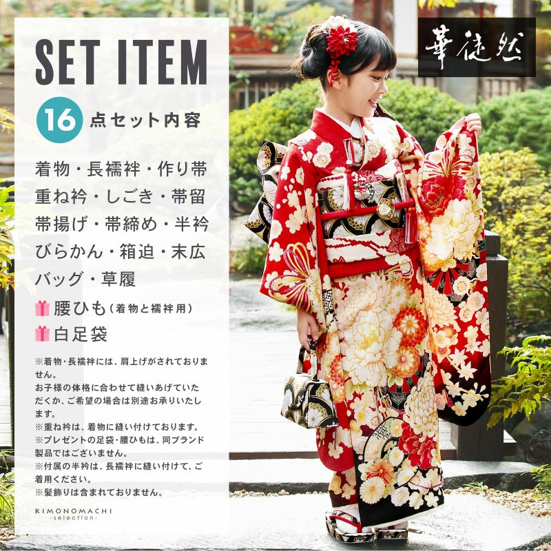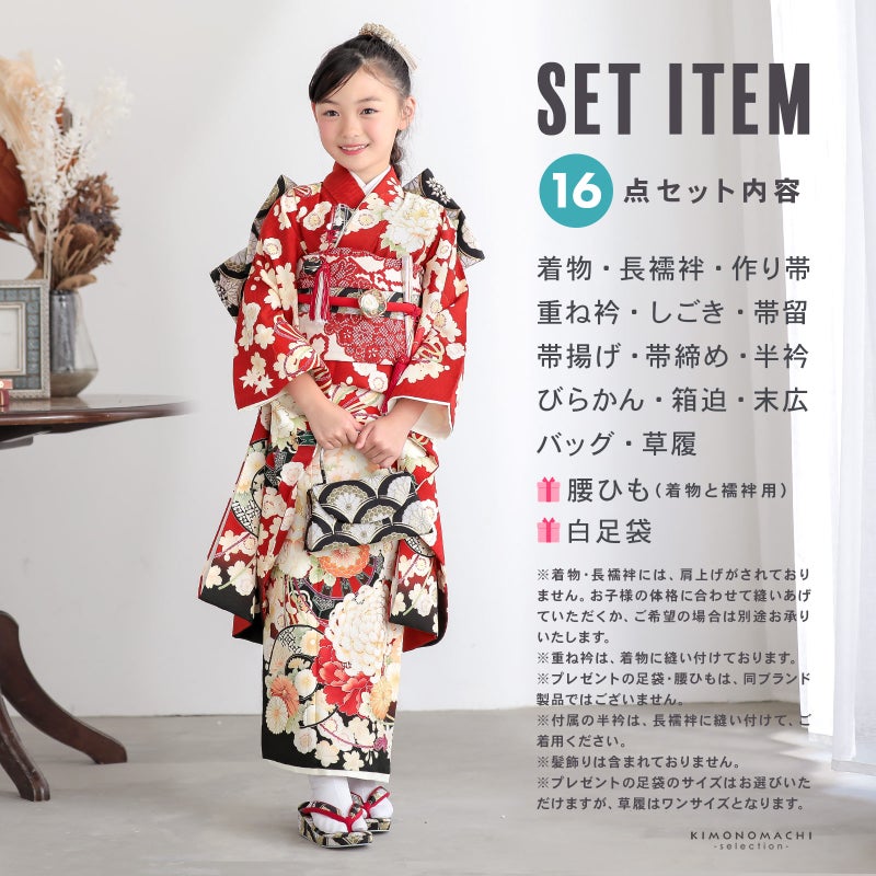 【商品内容】着物・長襦袢・作り帯・重ね衿(縫い付け済)・しごき・帯留・帯揚げ・帯締め・半衿・びらかん・箱迫・末広・バッグ・草履・腰ひも3本(プレゼント)・足袋(プレゼント)の計16点