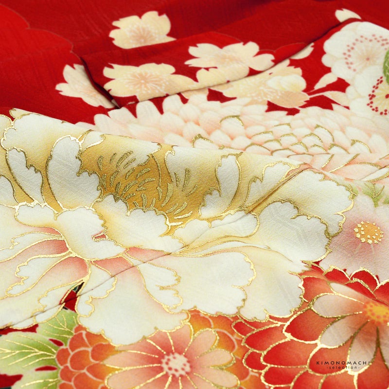 着物:紗綾形の地模様、くっきりとした赤の雲取りの地。裾に黒ぼかしの雲取り。梅や桜、楓が全体に散らされ、その上に深い赤紫、藤紫、淡い紺や生成り色を基調とした八重菊や牡丹を紫、青藤色、青磁色の組紐で飾った大きな花束文様。こげ茶や黒の車や鼓の表革が全体を引き締めます。ポイントに金彩。重ね衿は淡いピンクベージュ。長襦袢はごく淡いピンク。白の縮緬の半衿。