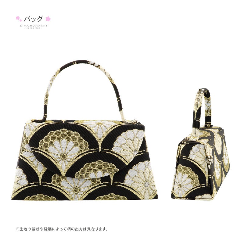 草履・バッグ:バッグと草履の台、鼻緒は、黒地に白、ベージュ、イエローゴールドで表現された梅、桐、菊紋を詰めた青海波文様。鼻緒の裏と前坪は赤。