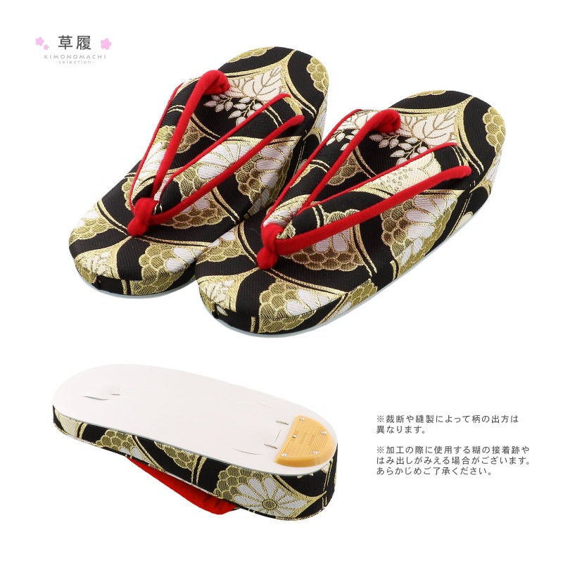 草履:台全長約21.5cm / 幅約7.6cm / 鼻緒幅約2cm / かかと高さ約5cm