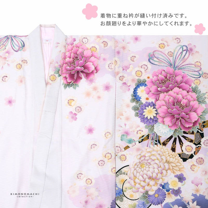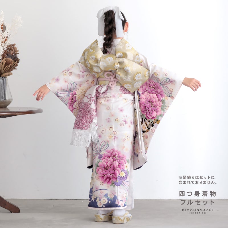 七歳の七五三(四つ身着物)の着付けに必要なものが揃ったフルセットです。お洒落で女の子らしい雰囲気。衿元も重ね衿がついているので華やかです。