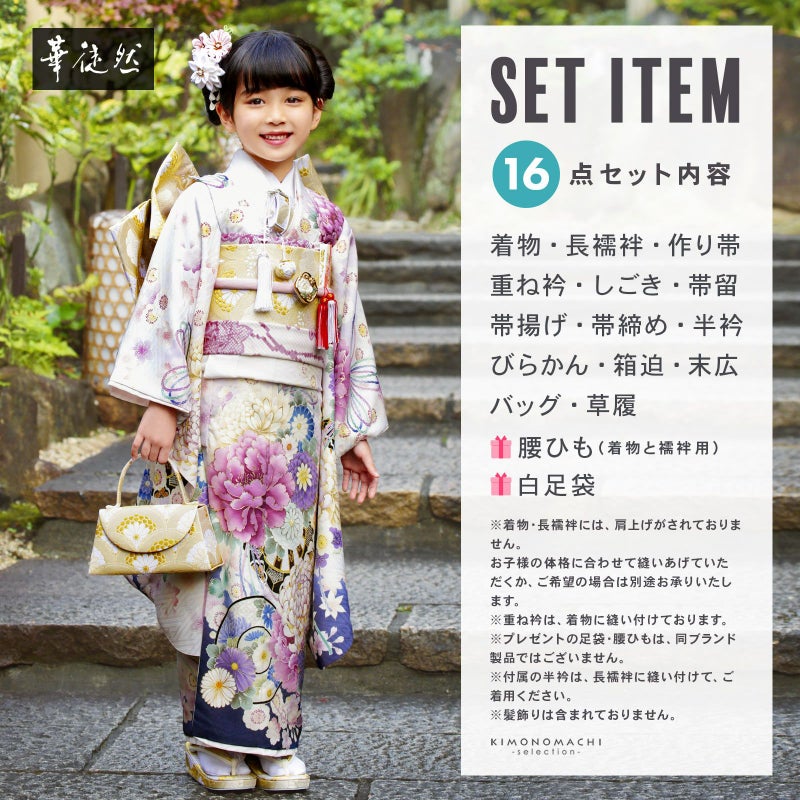【商品内容】着物・長襦袢・作り帯・重ね衿(縫い付け済)・しごき・帯留・帯揚げ・帯締め・半衿・びらかん・箱迫・末広・バッグ・草履・腰ひも3本(プレゼント)・足袋(プレゼント)の計16点