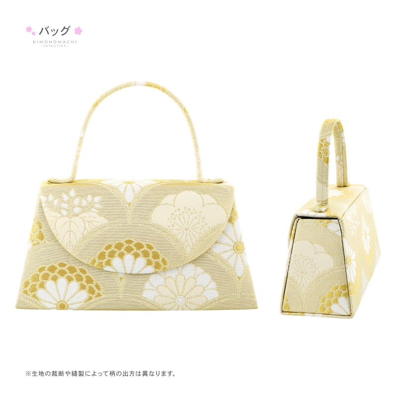 草履・バッグ:バッグと草履の台、鼻緒は、明るいゴールドに白、アイボリー、イエローゴールドで表現された梅、桐、菊紋を詰めた青海波文様。