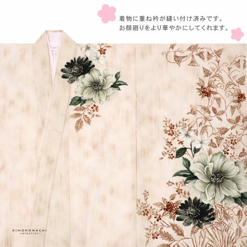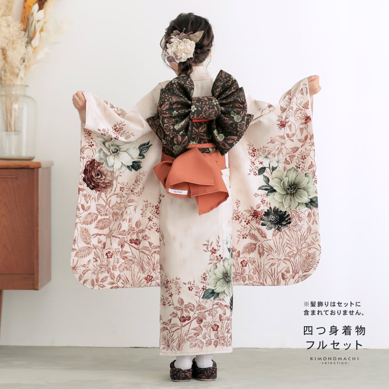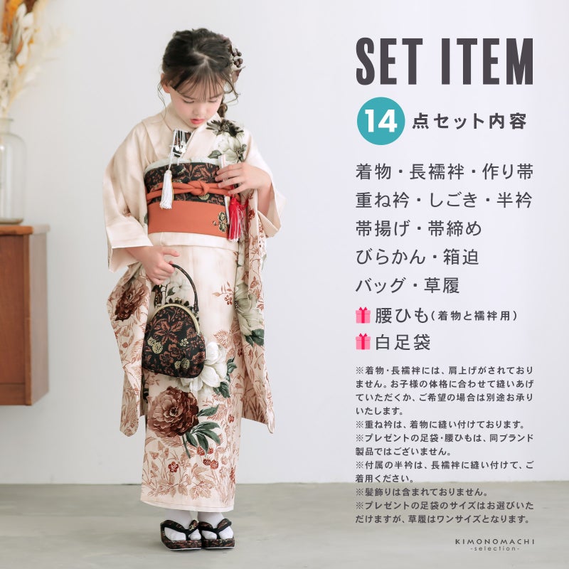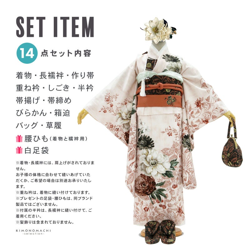 【商品内容】着物・長襦袢・作り帯・重ね衿(縫い付け済)・しごき・半衿・帯揚げ・帯締め・びらかん・箱迫・バッグ・草履・腰ひも3本(プレゼント)・足袋(プレゼント)の計14点