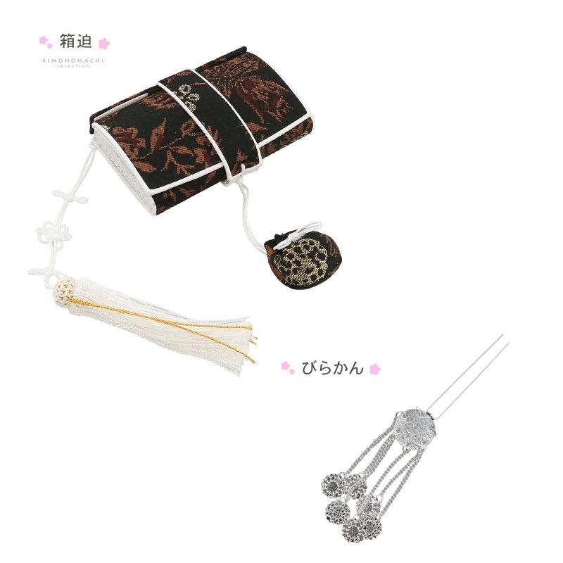着物・結び帯・しごき・帯揚げ・帯締め(丸ぐけ)・箱迫・半衿・びらかん・バッグ・草履:日本製