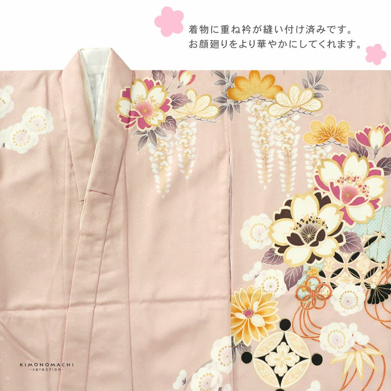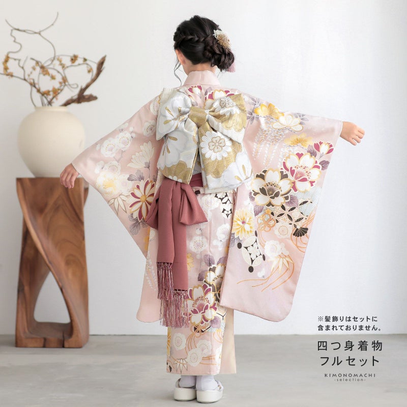 七歳の七五三(四つ身着物)の着付けに必要なものが揃ったフルセットです。お洒落で女の子らしい雰囲気。