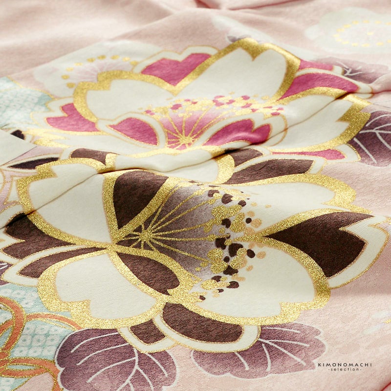 着物:桜の花びらの地模様のあるグレイッシュなピンク色の地。花七宝紋に水色の鹿の子模様の檜扇。その上に白、淡い赤紫、薄橙色、グレージュなどの枝垂れ桜や藤、菊に八重桜。ポイントに金彩。アイボリーの重ね衿。白の長襦袢。