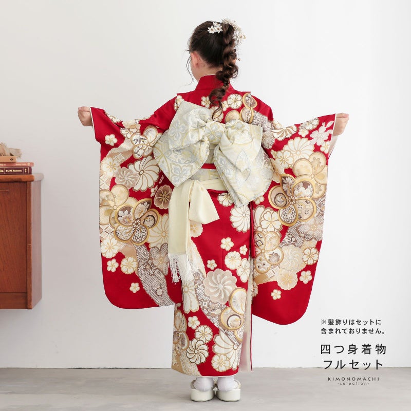 七歳の七五三(四つ身着物)の着付けに必要なものが揃ったフルセットです。お洒落で女の子らしい雰囲気。