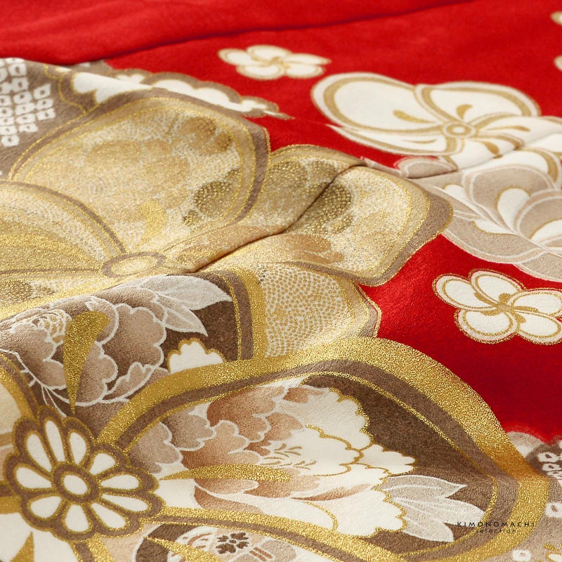 着物:紗綾形に花の地模様のある赤紅色の地。白、白茶に白橡色、グレージュ、ベージュ系の配色で吉祥紋を詰めた道長取り。その上に大小の捩じ花や桜、梅、菊の花紋。ポイントに金彩。アイボリーの重ね衿。白の長襦袢。